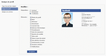 Par d�faut, le badge comprend juste le logo Facebook et une miniature de votre photo de profil. Vous pouvez le visualiser dans la zone Aper�u.
